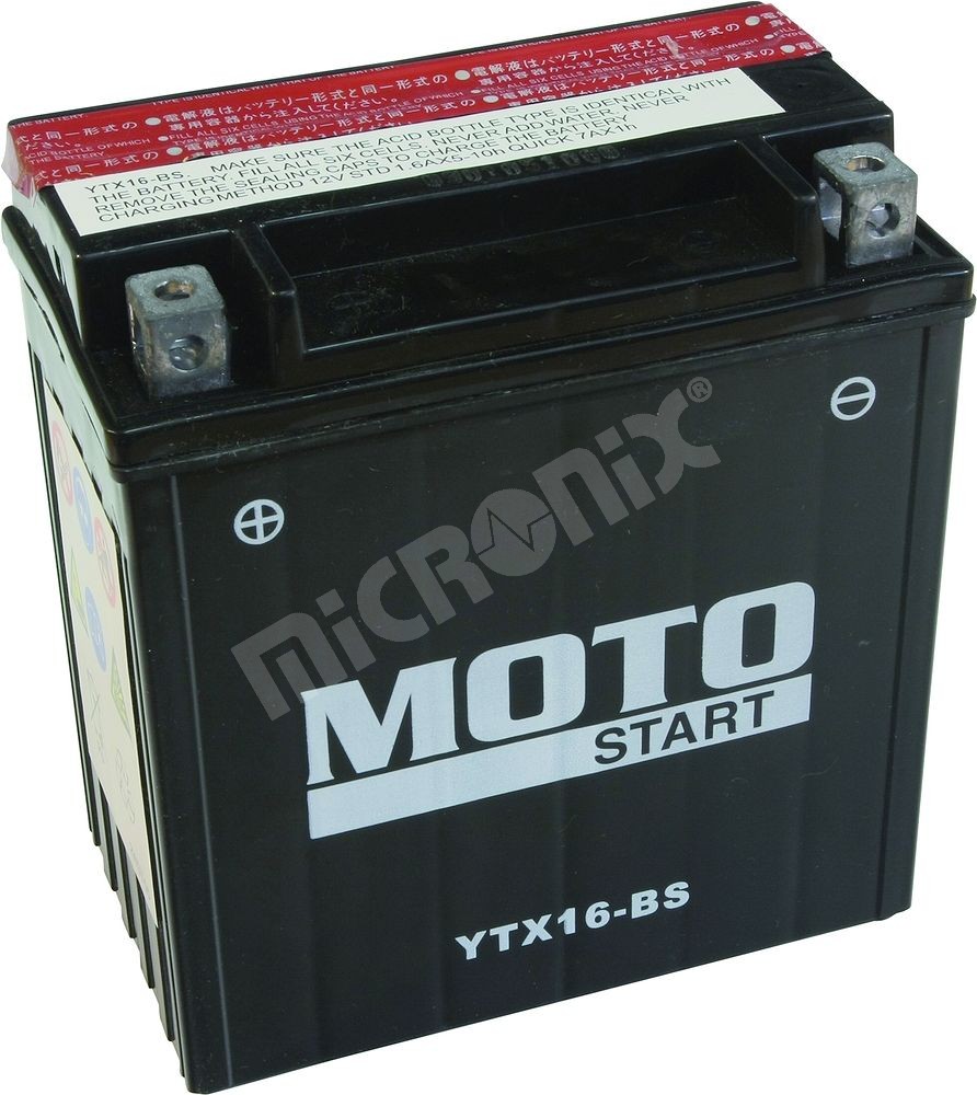 Olovená bezúdržbová batéria MS-YTX16-BS MF/Ca (Maintenance Free), vysoký štartovací prúd, nízke samovybíjanie.