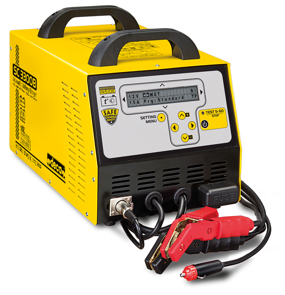 SC 3300B - Automatická mikroprocesorom riadená nabíjačka, tester a štartovací vozík pre 6V/12V/24V akumulátory. Výrobca firma DECA. Nabíjačka je určená pre nabíjanie olovených, bezúdržbových (MF), AGM, gélových akumulátorov a Ni-Cd akumulátorov kapacity 5Ah - 800Ah.