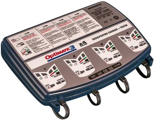 Optimate 3x4 sú 4 automatické nabíjačky v jednej 4 x 12V / 4 x 0,8A. Výrobca TECMATE. Dovozca spoločnosť MICRONIX, spol. s r.o. Nabíjačka slúži pre nabíjanie až štyroch olovených bezúdržbových, Super MF, VRLA alebo záložných batérií kapacity 3 až 40Ah.