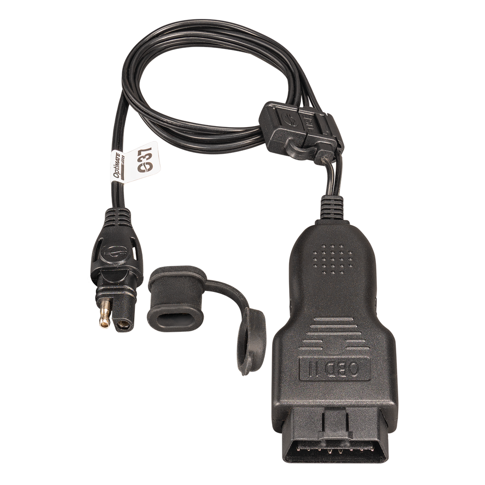 Konvertuje OBDII port auta alebo pick-upu umiestnený v kabíne/priestore pre cestujúcich na konektor nabíjačky batérií OptiMate SAE.